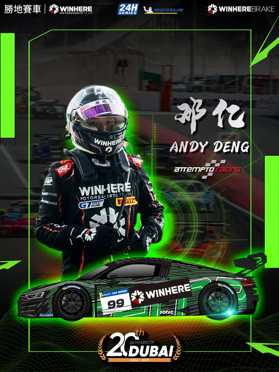 At the beginning of the New Year, the new racing season has opened. In mid-January, 2025 The Middle East Cup of 24 Hours endurance racing officially kicked off in Dubai! Winhere Racing team will form a partnership with German powerhouse Attempto Racing, WINHERE lead driver Deng Yi will drive his Audi R8 LMS GT3 Evo II in Dubai for 24 Hours and ABU Dhabi 6 Hours Endurance. Winhere will be official sponsor for Dubai 24 Hours and ABU Dhabi 6 Hours these two big events.